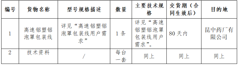 昆明中药厂有限公司高速铝塑铝泡罩包装线设备采购招标公告